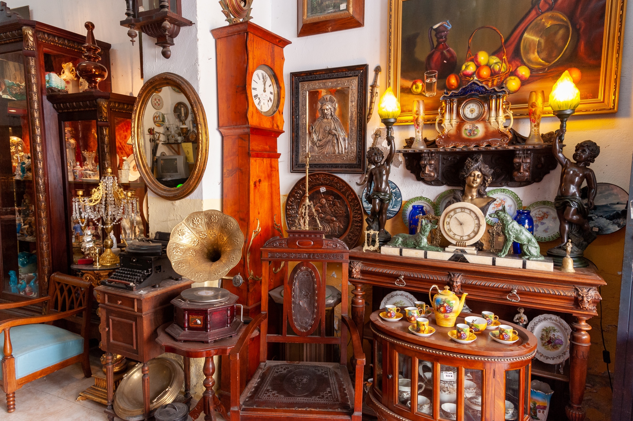A cluttered antique shop with various vintage items including clocks, gramophones, paintings, and ornate furniture.