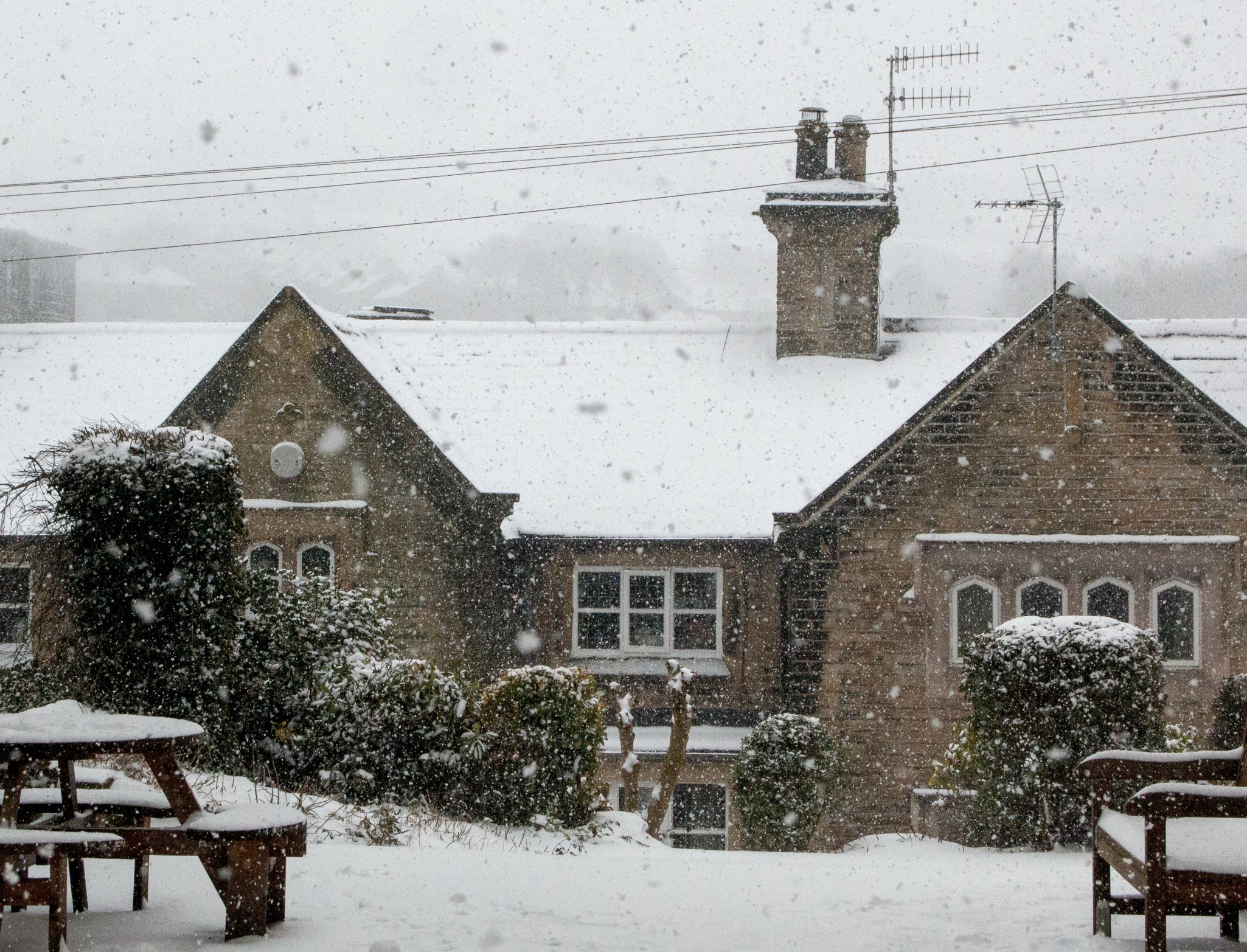 Heavy snow falls on a row of old stone houses and surrounding trees with snow-covered picnic tables in the foreground.
